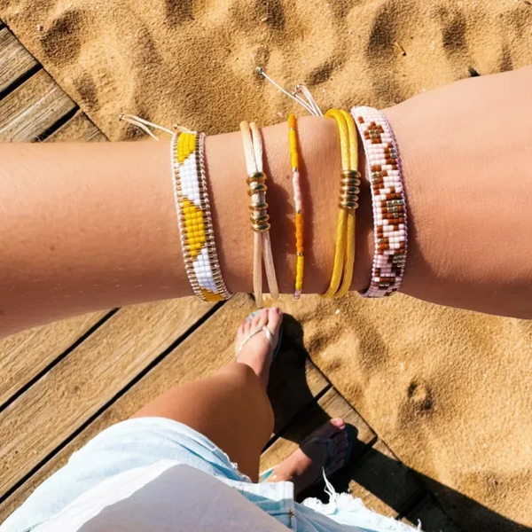 Het weef armbandje is voorzien van een schuifknoopjes en daardoor verstelbaar.